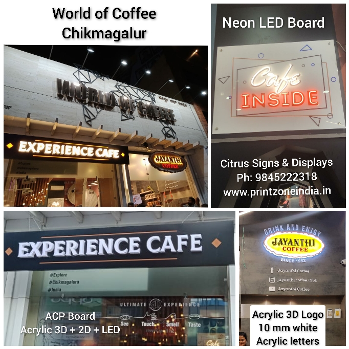 ACP Acrylic LED Signs are being increasing used in Tier 2 cities. Recently, we got an opportunity to make signages for World of Coffee at Chikamaglur. We made ACP LED sign ages, Neon LED Signs and simple 10 mm Acrylic letters.