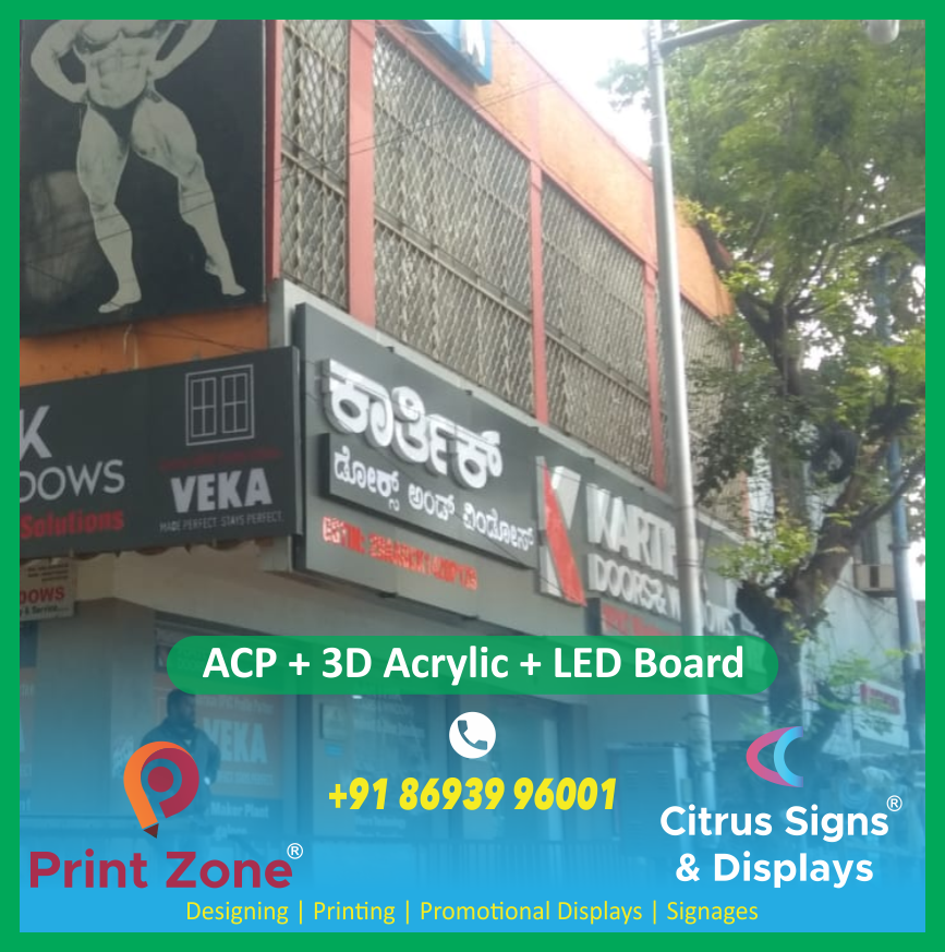 ACP Signage: Made of ACP + 3D + 2D letters. It is powered by LED modules with 5 years warranty. Crisp design & amp; Simple sign creates the necessary impact on the people viewing them. The front signage is made of Bullet LED'S which emits high intensity light, thus forcefully making heads turn towards the signage. Stand out of the clutter with these kind of signs.