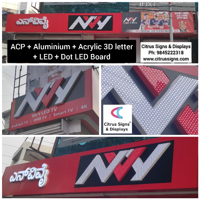 Signages are the first point of contact with potential customers. These sets the expectations and attract5h customers to your store / outlet. It defines your brand identity. We make stunning signages in ACP, Acrylic, Aluminium, SS, Titanium Gold, Brass, LED. We specialise in Neon LED signs. We recently installed signages at NVY TV showroom in Koramangala. For more info visit www.citrussigns.com
